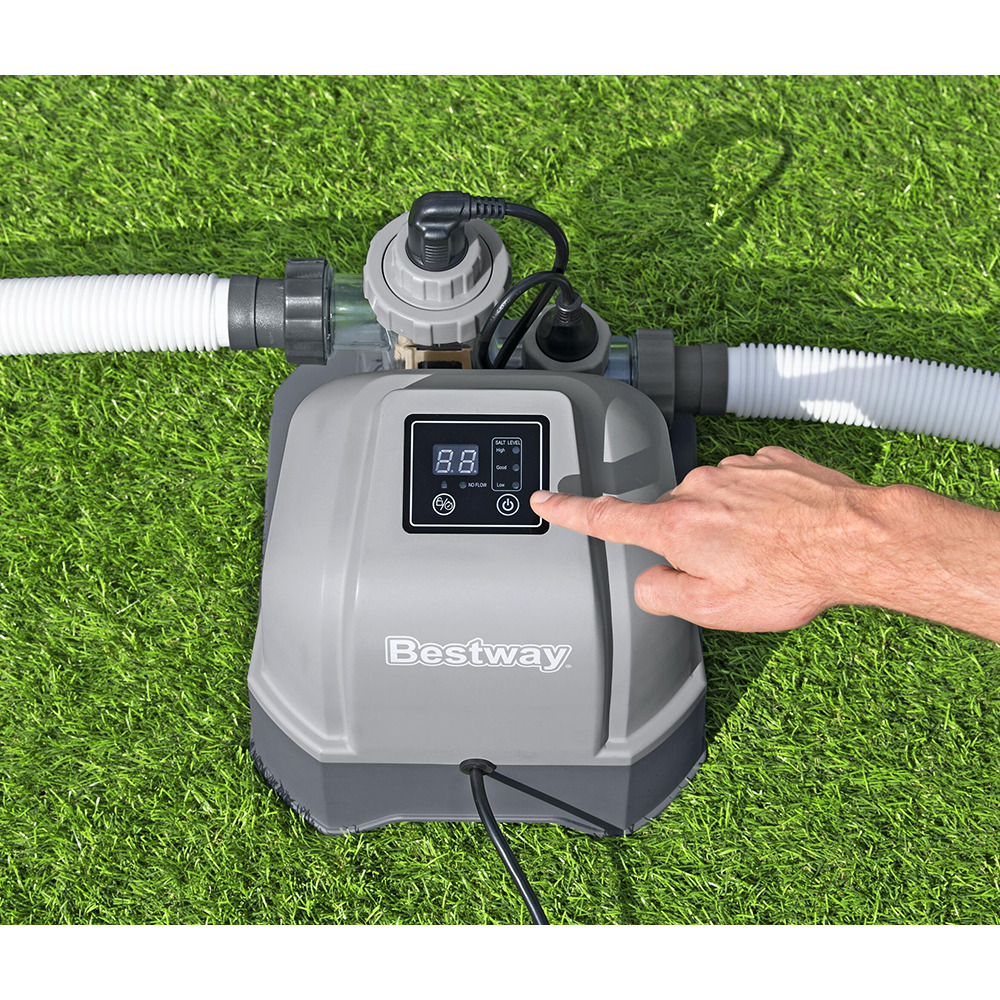 В качестве реагента используется обычная поваренная соль (не йодированная), которую необходимо растворить в бассейне. Далее в процессе электролиза из нее выделяется свободный хлор, который не имеет запаха и не раздражает кожу или слизистую оболочку глаз. Вода становится морской.