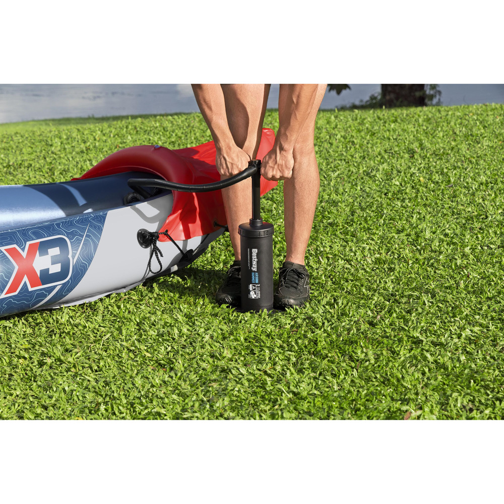 Надувная байдарка трехместная с алюминиевыми веслами и ручным насосом, Bestway 65132, выполнена из суперусиленного ПВХ, обеспечивая высокую ударопрочность и стойкость к истиранию.